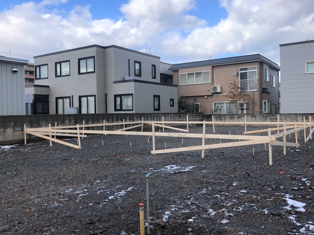 で、この「遣り方」の後に基礎工事が入るのですが、その基礎の基準となる非常に大事な作業なんですね(^^)/(その割にアナログな感じでやってますが笑)ちなみに基礎工事の後は、遣り方用の杭やぬきは撤去されてしまうので意外と見れる期間としては短めだったりします。