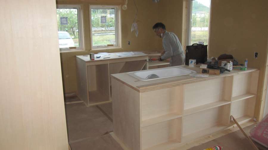 『キッチンカウンターの柱飾りが でぎだがら みにきてケ~』と