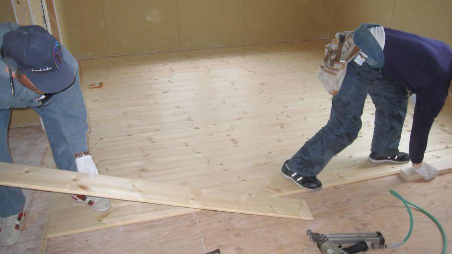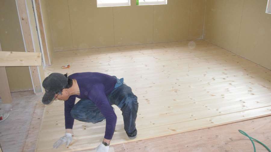 (長さ3500~3900mm、厚さ21mm、幅135mm無塗装品)貼り開始です。