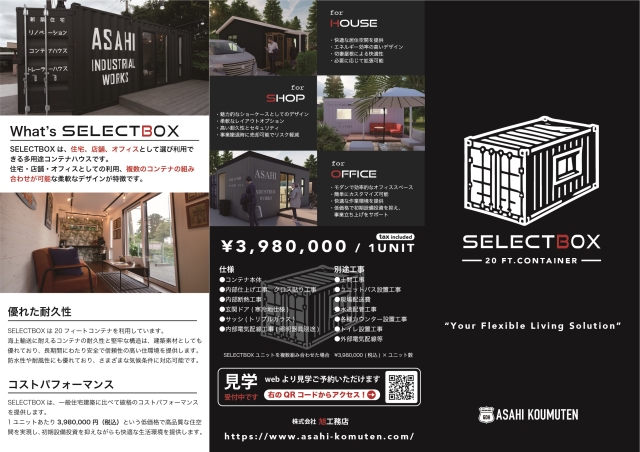 こんにちは。 建築課の濱田滉大です。 6月29日(土)、30日(日)の2日間で行われるコンテナハウス「SELECTBOX」見学会に向けた準備が進んでおります! 相変わらず旭工務店はどこに向かっているのでしょうか(笑)という心配ごとは置いといて(^^;今回、見学会にご参加いただいた方でコンテナハウス「SELECTBOX」に興味がある方向けに詳細が記載しているリーフレットをお渡しします!! 金額や仕様、コンテナハウスの特徴等が分かりやすく掲載されています(^_^)これを見れば一目瞭然です!! 更に裏面には「HOUSE」、「SHOP」、「OFFICE」の3つのPLANの平面図や説明が一目で分かるようになっています。さあ、皆さんも欲しくなってきましたよね?今すぐ、TEL017-788-2266または見学予約カレンダーからご予約ください!…という宣伝blogでした(笑) ※時間帯によってはすでに予約が埋まっているところもありますので、ご予約をお考えの方はお早めにお願いします。 コンテナハウス「SELECTBOX」見学会開催! 会場 青森市新城山田208-36(旭工務店敷地内) 開催日時 6月29日(土)、30日(日)10時~17時 お問い合わせ先 TEL017-788-2266または見学予約カレンダーから ・ご氏名 ・参加希望日、時間 ・参加される人数 ・ご住所 ・ご連絡先 をご記入ください。 旭工務店公式LINE@では直接のお問い合わせメッセージもお待ちしております。 家づくりに関しての気になる疑問から、具体的なお悩みまで、お気軽にご相談下さい