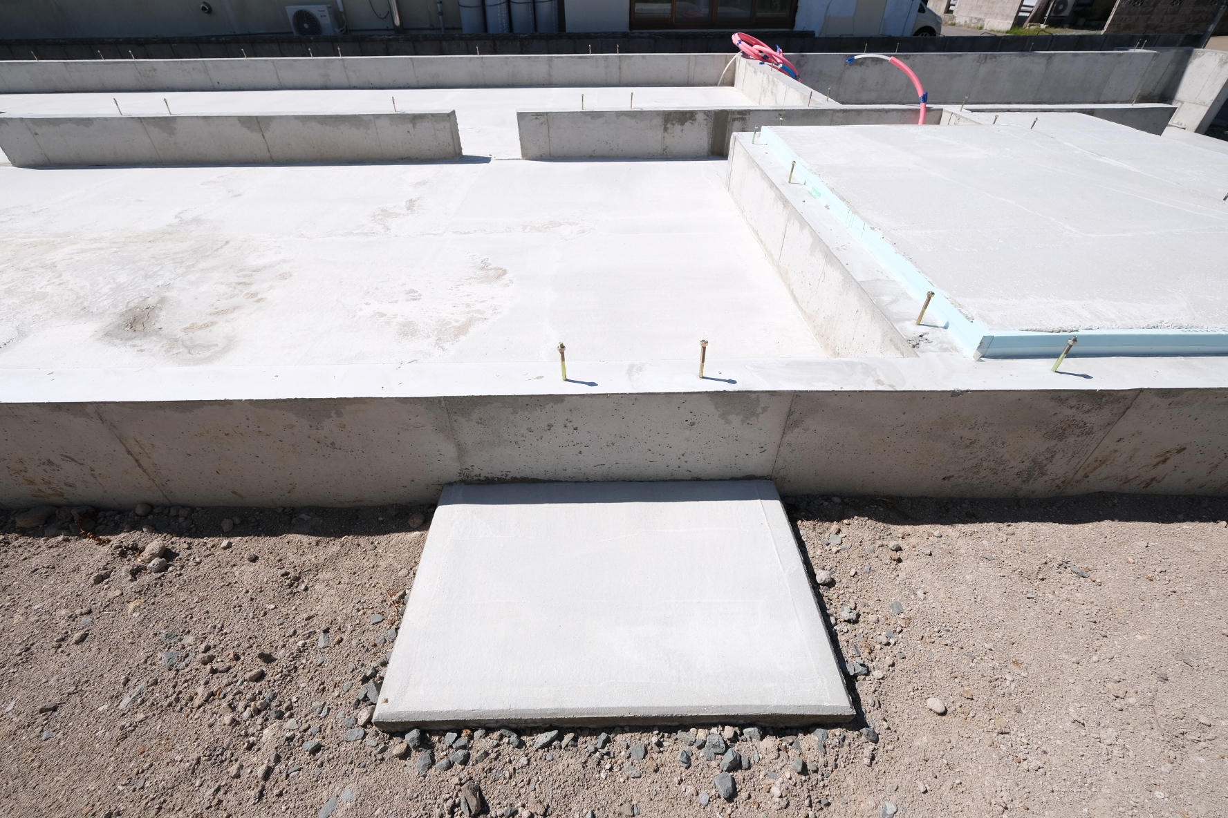 こんにちは。 建築課の濱田滉大です。 先日、基礎工事の様子をお伝えした新城の現場は、基礎工事が完了してますが実はこの段階で、床下部分における給排水といった配管工事は行われています。 なぜかというと、このまま「土台敷き」を行ってしまうと、床下に配管するのに効率が悪くなるからですね。(考えてみれば当たり前ですが笑)写真でもよく見てもらえれば、配管がされているのがわかります。 一般的な住宅建築においての配管工事は、(大体の場合は)建物本体のまわりや床下といったの外部の配管工事を先に行って基礎の完了後に、外部からの配管と内部の配管を繋いでその後に建て方(建物工事)を行います(^^)/基礎は縁の下の力持ち的なポジションなのであまり注目されることが少ないですが、こういった配管工事といった細かい工事も行っています。 なので、現場で見学する際にピンクやブルーの配管があったとしても邪魔にせずに(笑)優しく避けてあげてくださいね(笑) 旭工務店公式LINE@では直接のお問い合わせメッセージもお待ちしております。 家づくりに関しての気になる疑問から、具体的なお悩みまで、お気軽にご相談下さい