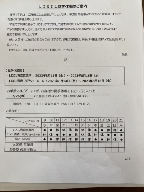 こんにちは。 建築課の濱田滉大です。 8月のお盆に向けて早くもいろんな業者やメーカーから夏季休業のお知らせが入っております。実はお盆期間は各ショールームで休業期間が設定されています!LIXILさんをここでは取り上げさせてもらいますが… このようにお盆期間前後ぐらいまでが一般的ですね(^ ^)さて、この長期のお休みに入る前に皆さんにお知らせしておきたいことがあります。というのもこのような長期のお休みの直前というのは一年の中で、一二を争うほど、「住宅設備の修理依頼が殺到する」という事です(>_<)長期のお休みの前にこれまでそのままにしていた、依頼を忘れていたという部分の修理依頼等が多くなる傾向があります!!しかも、本当に直前の時期となるとメーカーがすでにお休みだったりしたりと対応が出来かねる状態になることも考えられます(-_-;)その為、毎年お早めの修理依頼等のご連絡をお願いしておりました。とはいっても、こういうものが何時壊れるのはだれにも予想できません。私もできません(笑)どうしても、修理依頼が休業期間中になってしまうという事もあるかと思います。 そういった時のために各メーカーさんは修理依頼用のお問い合せ先を設定している場合もあります。(TOTOさんも書いてますね)他のメーカーさんもホームページ等に記載している事が多いので、まずはそちらにご連絡していただくことをお勧めします! 旭工務店公式LINE@では直接のお問い合わせメッセージもお待ちしております。 家づくりに関しての気になる疑問から、具体的なお悩みまで、お気軽にご相談下さい