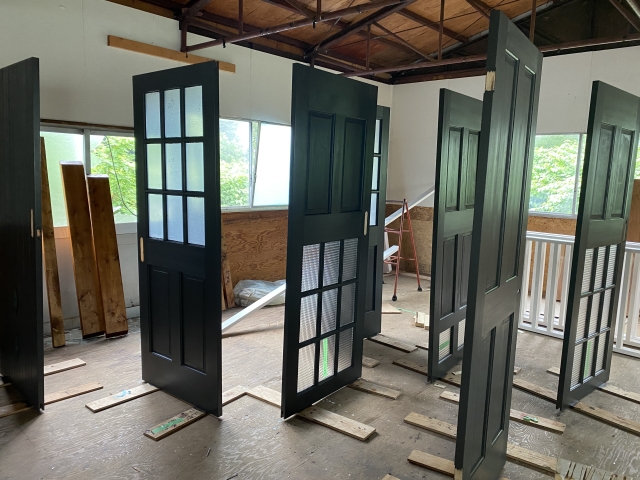 こんにちは。 建築課の濱田滉大です。 旭工務店では、家造りをする際に建具等もオーダーをして造ることができます(^_^)そんな時は建具職人の加藤さんを中心に作成することになります。で、今回の新築中の現場につく予定の加藤先生の新作(もとい建具笑)のほうが仕上がったという事で見に行ってきました! 今回はクールな色合いに仕上がりましたね(^^)/ 一応説明しておくと、この場合の建具というのは「建築物の開口部に設けられる開閉機能を持つ仕切り。おもに壁(外周壁や間仕切壁)の開口部に取り付けられて扉や窓として用いられる物」という事です。そのまんまですが、一応(笑) こちらのドア等は、一枚一枚塗装の色を指定することが出来るのでお施主様のオリジナリティが出ます!「今回は白系が多め」とか「ブラウン系が多めだな…」とかその建物によっても変わってくるんですね(^_^) ちなみに塗装した直後の建具は乾燥させる時間が必要なので、専用の作業小屋(笑)に格納されています。その為、この状態の建具を実際に見る機会は中々ないのですが、もし「どうしても見たい!!!」という方は、私の方から加藤先生にお願いしてみますので、下のlineからお問い合わせください(笑) 今から取り付けが楽しみですね。現場に取り付け次第、私のblogでもお伝えしますのでお楽しみに! 旭工務店公式LINE@では直接のお問い合わせメッセージもお待ちしております。 家づくりに関しての気になる疑問から、具体的なお悩みまで、お気軽にご相談下さい