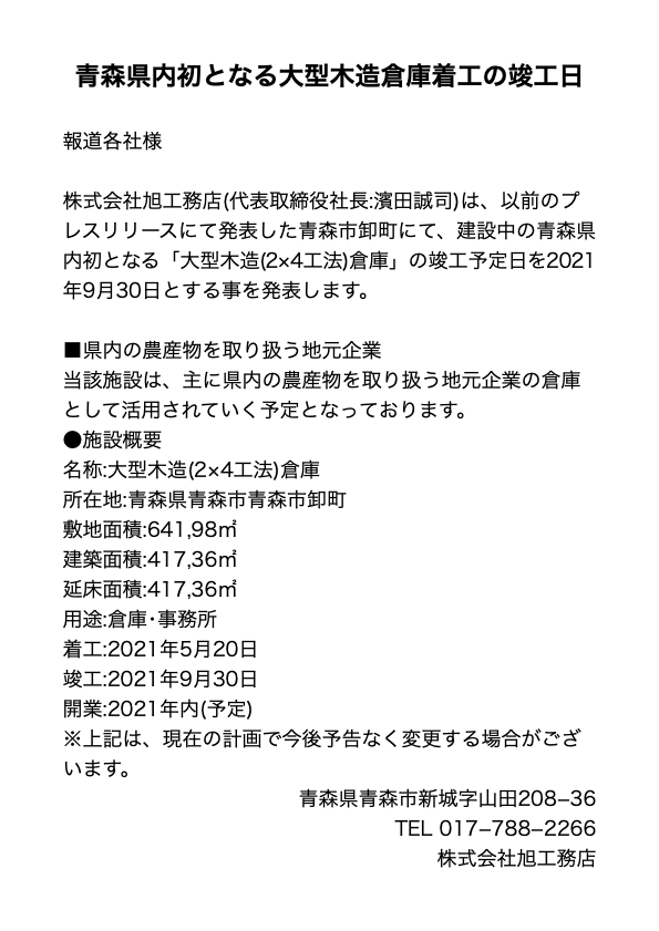 株式会社旭工務店は、以前のプレスリリースにて発表した青森市卸町にて、建設中の青森県内初となる「大型木造(2×4工法)倉庫」の竣工予定日を2021年9月30日とする事を発表します。