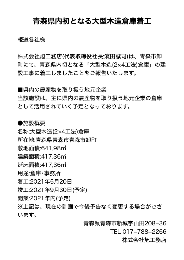 こんにちは。 建築課の濱田滉大です。 株式会社旭工務店は、2021年5月20日に青森市卸町にて、青森県内初となる「大型木造(2×4工法)倉庫」の建設工事に着工しましたことをご報告いたします! っていうのを新着情報のプレスリリースとして掲載したって話なんですが(笑) 実は現在進行中の現場の一つが「青森県内初の大型木造(2×4工法)倉庫」の現場になるんですね!私も社長に教えてもらって初めて知ったんですが(笑) それを記念して、プレリリースという形で掲載しておりました(^_^)どっか取材に来ないかな笑 本リリースに関する報道関係のお問い合わせ 株式会社旭工務店 担当:濱田 TEL:017-788-2266 MAIL:kkasahi@basil.ocn.ne.jp