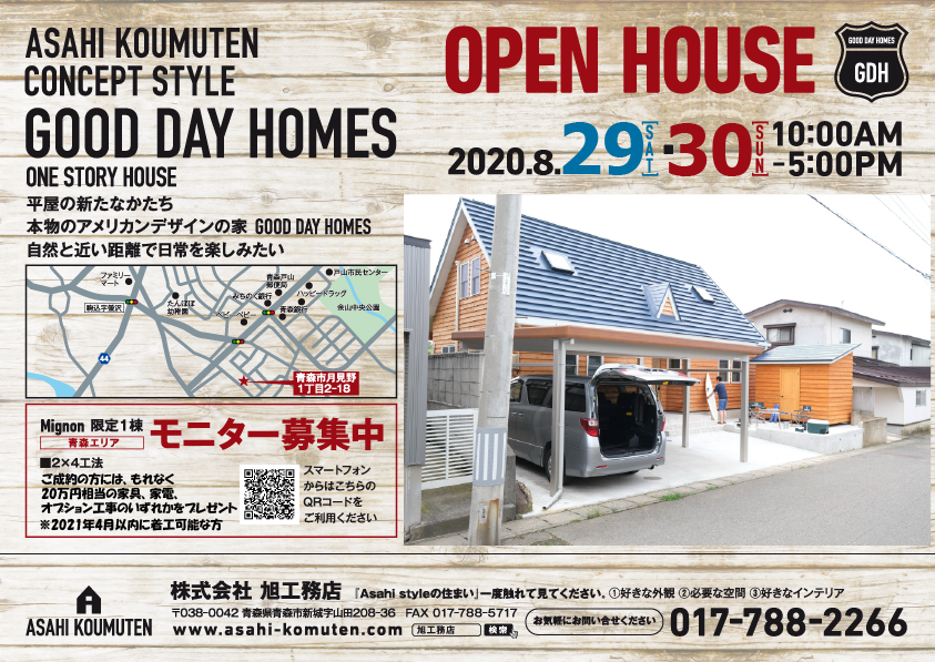 こんにちは。 建築課の濱田滉大です。 前回、多くの来場者様から好評を頂いた平屋の新たな形「ONESTORY HOUSE」を皆さんからのご要望にお応えしまして、8月29日(土)、30日(日)の2日間にてオープンハウスを開催いたします!! 会場は前回同様、青森市月見野1丁目2-18で行います。 今回が初解禁という体で進めていますが、実は動画の方で先に情報が出ていました(笑)その為、皆さん大体お分かりだと思いますが(^-^;
