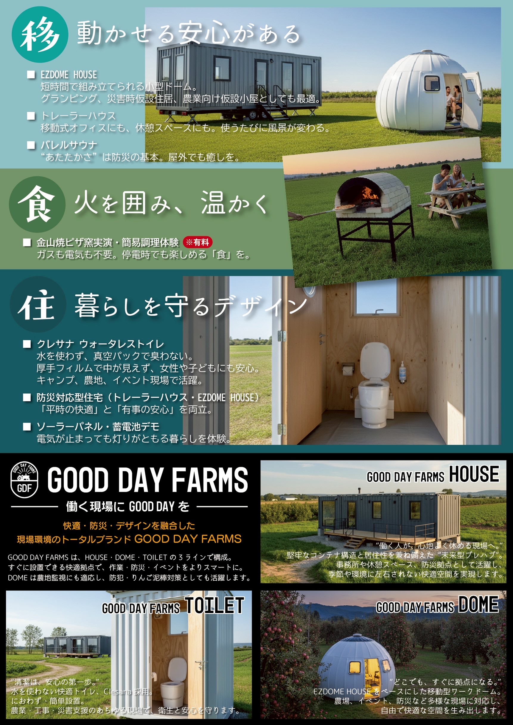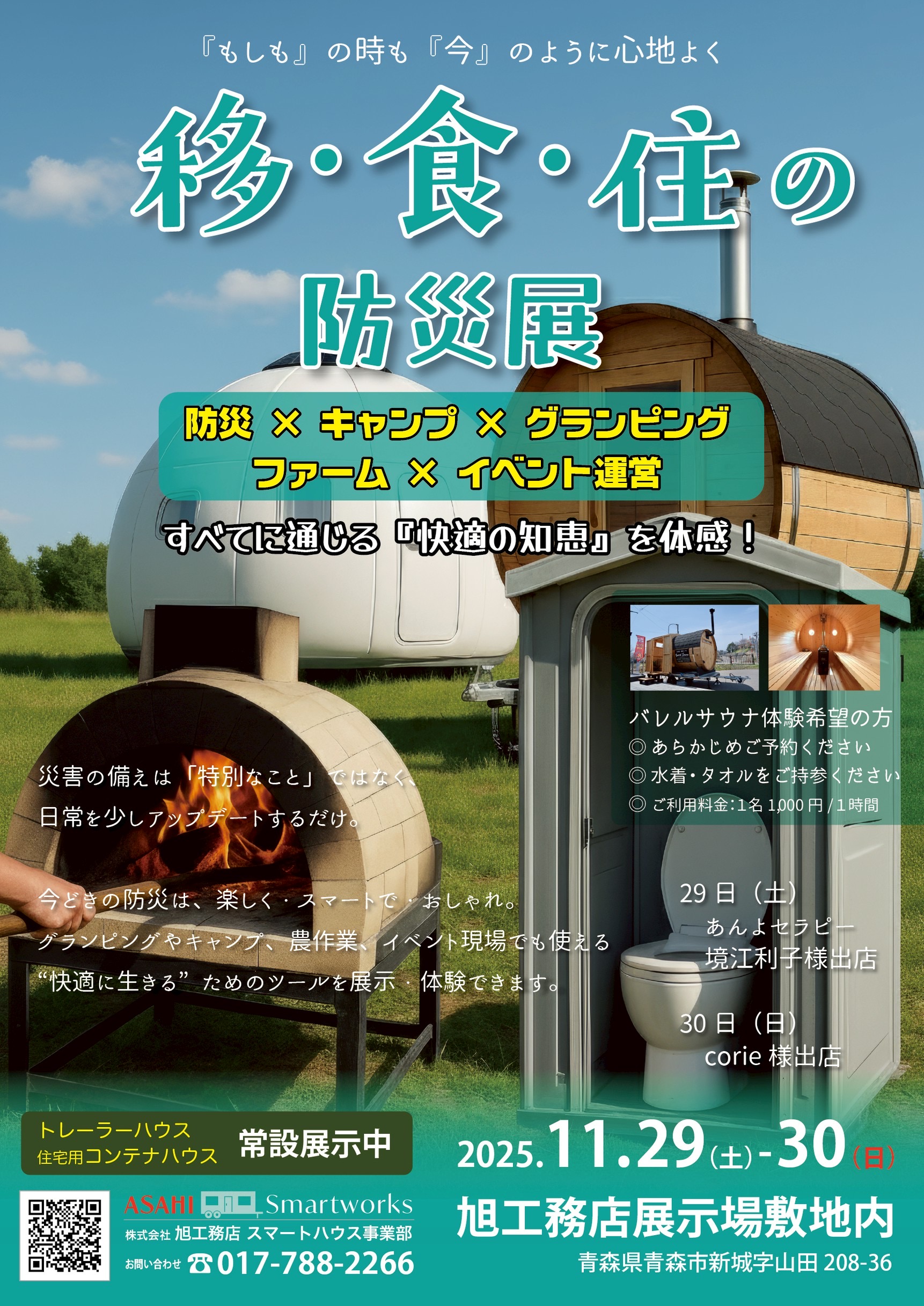 こんにちは。 建築課の濱田滉大です。 新着情報にも記載していましたが、11月29日(土)、30日(日)に移・食・住の防災展を開催します! 「防災 × キャンプ × グランピング × ファーム × イベント運営」をテーマに、“快適に生きるための知恵”を体感できる展示・体験イベントです。災害時だけでなく、普段の暮らしやアウトドア、農作業、イベント現場でも活用できる多用途なツールや設備を紹介。 主な内容と展示 ・DIYで組み立て最短90分のアウトドアだけではなく災害時の仮設避難所として使用できるEZ DOME HOUSEの展示、体験会 ・水が不要で無臭で衛生的で災害対策としても活躍する高品質ウォーターレストイレ「クレサナ」の体験会 金山焼ピザ窯のピザ試食会(有料)等を行います!この為の窯でした決してピザが食べたかった訳ではありません(笑) ご出店の皆様 29日(土)あんよセラピー境様 フットマッサージ15分1,000円(5分間のフットバス付き)、10分延長1,000円 30日(日)corie様 ベーカリー 災害の備えは特別なことではなく、日常を少しアップデートするだけ。「楽しく・スマートで・おしゃれな防災」を体験しながら、“もしも”の時にも“今”のように心地よく過ごせる暮らし方を感じてください。 バレルサウナは1時間、1名1,000円での開催となります。またご利用時間は60分以内とさせていただきますので予めご了承ください。体験時には男女共に水着着用等をお願いします。当日はバレルサウナ→水風呂→外気浴の本格的なサウナをお気軽にご体験いただける機会になっていますので、皆様ぜひご参加くださいませ。ご不明な点がございましたら、ご来場の際にスタッフにお申し付けください。 ・体調が悪い場合、無理なご利用は控えてください。また利用後の体調の変化等も弊社での責任は負いかねます。 ・水着とタオルは最低限ご持参いただきまして、その他は必要に応じてご自身でご準備ください。 ・屋外の場所ですが、周囲から見えにくいように目隠した着替スペースは用意させていただきます。・荒天時は中止させていただく場合があります。 ・ご利用後にアンケートのご記入にご協力ください。 予約状況に応じて時間調整をお願いする事がありますので、予めご了承くださいませ。 ご予約やお問い合わせは→TEL 017ー788-2266