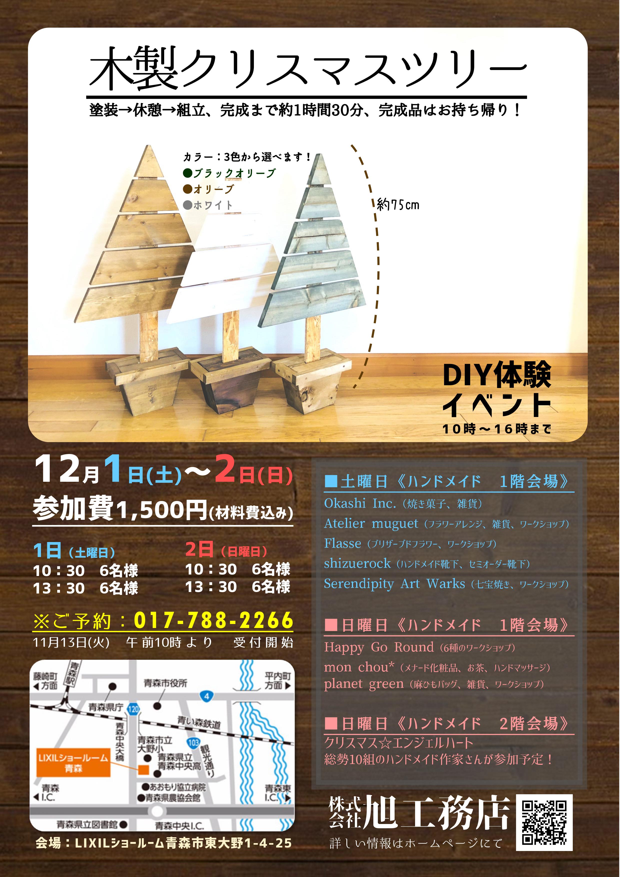 まだ冬タイヤに変えてない男。 建築課の濱田滉大です(それで毎年失敗してます笑) 昨日の見学会のお知らせに押されて、すっかり忘れてましたが今日から木製クリスマスツリー体験の申し込みがスタートしています(^^)/ 早くも埋まっている時間帯もありますのでご予約はお早めにお願いしますm(_ _)m(このblogの執筆時では、もうすでに土曜日の午前中、日曜日の午前中が埋まっております)「この体験を一年間待ってました」という熱心な方もいらっしゃいました(^^; さてさて、日時を見た方は気づいた方もいるかとは思いますが12月の1日、2日...これは昨日お伝えした久々のオープンハウス(見学会)の日程と一緒です!!!!つまり旭工務店史上初のイベント同時開催となります!!!!!!!!!(ビックリマーク大放出です笑)青森と平川、約40kmの距離でのイベント同時開催です。ここまで離れていると同時開催の意味があるのか分かりません(笑)