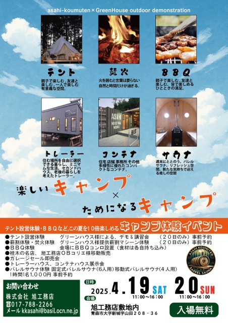 こんにちは。 建築課の濱田滉大です。 4/19(土)、20日(日)の2日間、旭工務店にてテント設営体験・BBQなど夏を10倍楽しめるキャンプ体験イベントを開催します(^^)/ アウトドアライフグリーンハウス青森店様ご協力の元、アウトドア初心者から上級者まで誰もが楽しめることををコンセプトに、キャンプを通じて自然との触れ合いのきっかけを作ることを目的としています。会場では、テント設営体験会、BBQ体験やバレルサウナ、薪割り、焚き火体験会など1日を通して楽しめる多彩なコンテンツをご用意しております。 4/19(土)は BBQ体験11:00〜 6組(会場にBBQコンロ設置、食材持ち込み制) 4/20(日)は テント講習10:00〜 (事前予約不要) テント設営体験11:00〜 2組 11:30〜2組 BBQ体験11:00〜 8組(会場にBBQコンロ設置、食材持ち込み制)という形になっています! 参加体験を希望される方は電話(017-788-2266)またはmail(kkasahi@basil.ocn.ne.jp)から ・ご氏名 ・参加される人数 ・ご住所 ・ご連絡先 をご連絡ください。 また当日は旭工務店敷地内にて、ガレージセールやコンテナハウス、トレーラーハウス、バレルサウナの見学(体験)会も開催します。 バレルサウナは予約制(1時間、1名1,000円)での開催となります。またご利用時間は60分以内とさせていただきますので予めご了承ください。体験時には男女共に水着着用等をお願いします。当日はバレルサウナ→水風呂→外気浴の本格的なサウナをお気軽にご体験いただける機会になっていますので、皆様ぜひご参加くださいませ。ご不明な点がございましたら、ご来場の際にスタッフにお申し付けください。 ・体調が悪い場合、無理なご利用は控えてください。また利用後の体調の変化等も弊社での責任は負いかねます。 ・水着とタオルは最低限ご持参いただきまして、その他は必要に応じてご自身でご準備ください。 ・屋外の場所ですが、周囲から見えにくいように目隠した着替スペースは用意させていただきます。・荒天時は中止させていただく場合があります。 ・ご利用後にアンケートのご記入にご協力ください。 予約状況に応じて時間調整をお願いする事がありますので、予めご了承くださいませ。もはや何屋かわかんなくなってきましたが(笑)皆様のご参加お待ちしておりますm(__)m