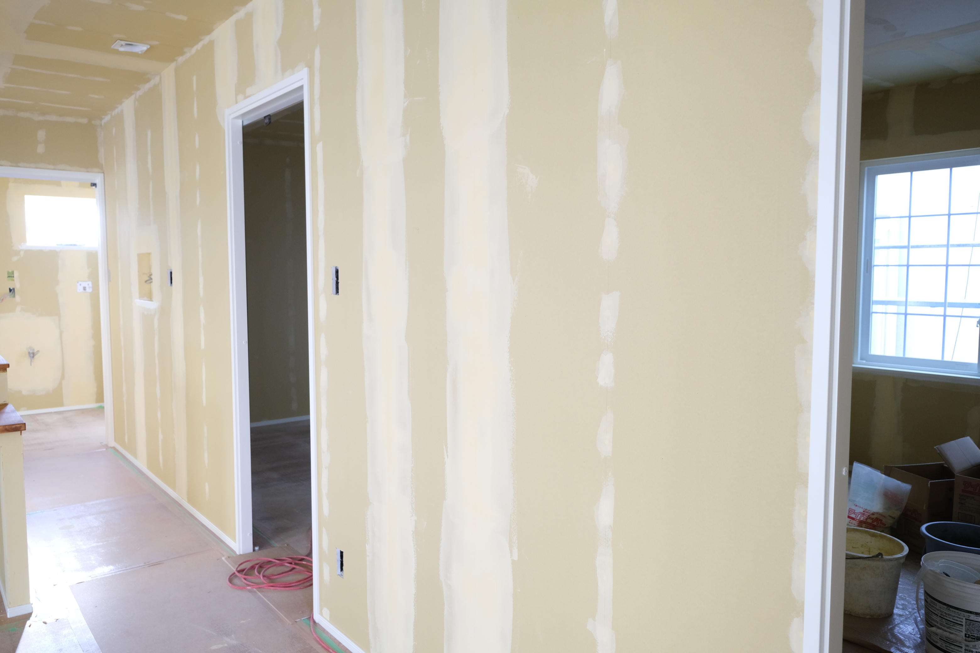 こんにちは。 建築課の濱田滉大です。 浪館の現場は只今、クロス(壁紙)貼りに向けた下地処理の段階に行っています! 一口に下地処理といってもなんのことやらさっぱりなので(^-^;簡単にまとめると「クロスを貼る前に下地の凹凸部分の処理をする」ことですね(^^)/ ぱっと見では分かりませんが下地に使われている石膏ボードには凹凸している部分があります。もし、機会があれば触って感じてみてください(ちなみに私はあんまり分かりませんが笑)そのまんまでクロスを貼ってしまうと壁紙が接着しずらかったり、場合によっては?がれてしまうので凹凸部分を埋めているんですね!専門用語だと、「パテ処理」なんて言ったりします(^_^)プラモデルの傷埋めなんかにもこの「パテ」は使われているので意外となじみのある方は多いのではないでしょうか。まあ、私の場合はパテと聞くと「ハンバーグか?」ってなりますが(笑) こういった事前の処理というのが、この後の段階に大事になってくるので地味ではありますが大切な作業です! 引き続き完成に向けて頑張っていきますので、次の段階に進むのをお楽しみに! 旭工務店公式LINE@では直接のお問い合わせメッセージもお待ちしております。 家づくりに関しての気になる疑問から、具体的なお悩みまで、お気軽にご相談下さい