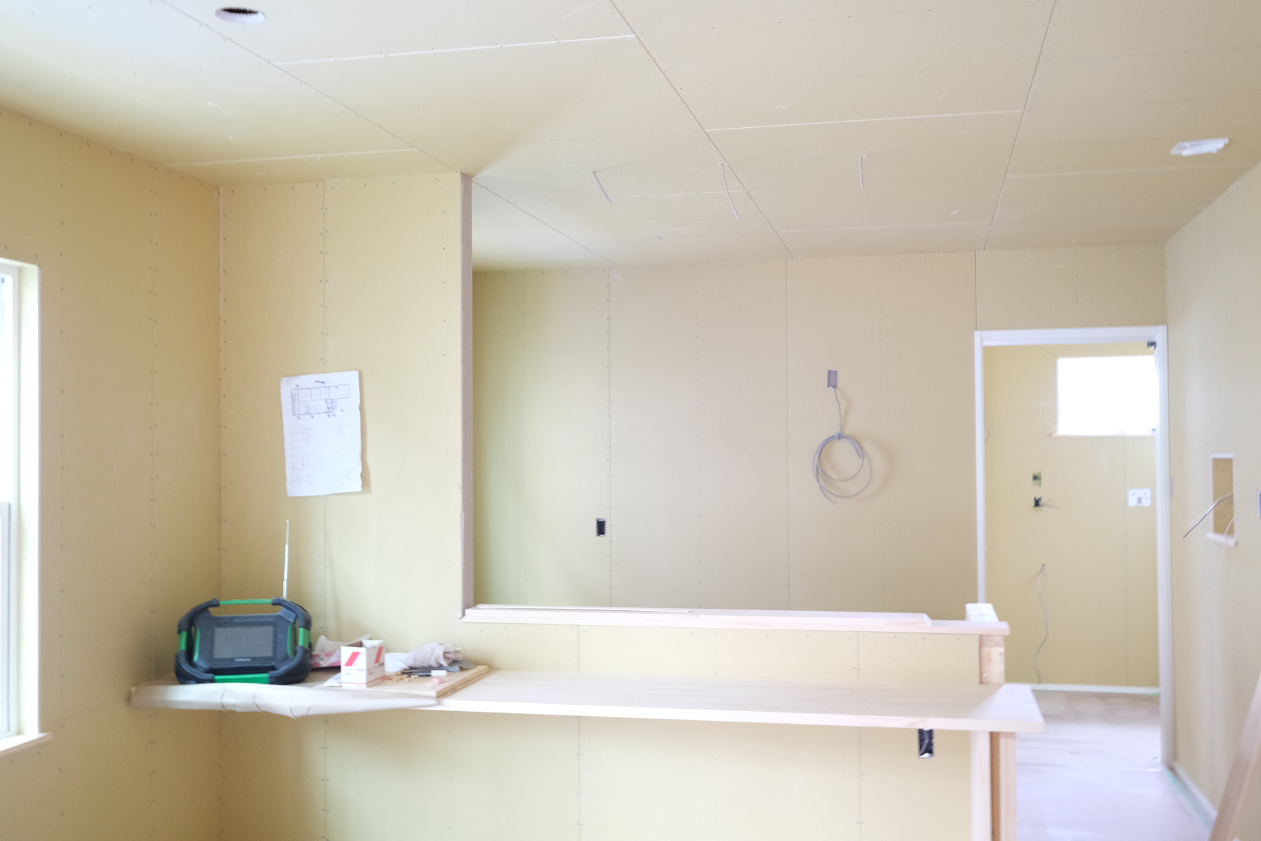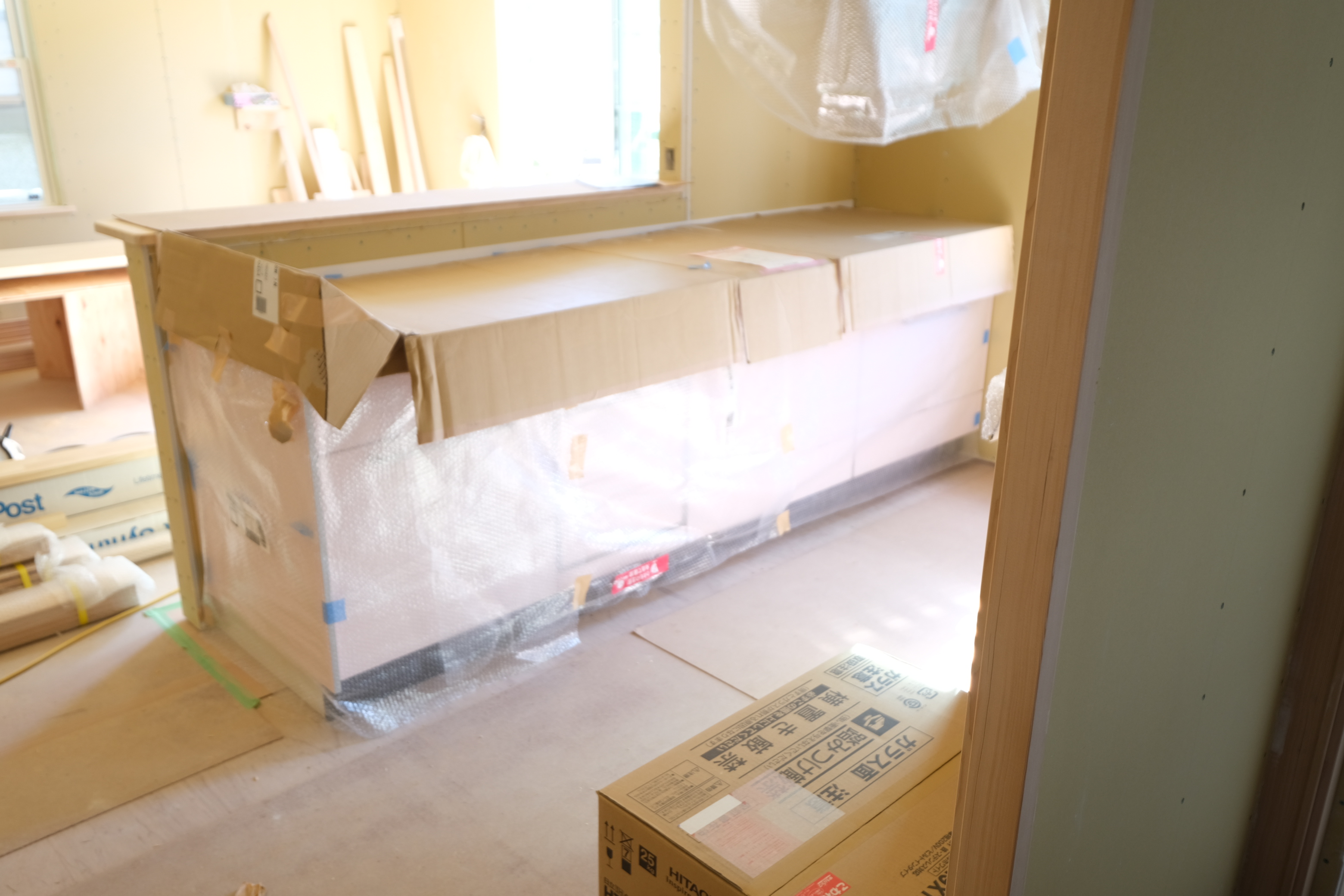 こんにちは。 建築課の濱田滉大です。 小柳の現場では内部工事が絶賛新進行中です ちなみに内部工事は、「家の構造工事」からスタートして、「断熱工事」→「フローリング工事」→「石膏ボード貼り」→「設備工事」→「クロス(壁紙)工事」ざっくり分けるとこういう感じで、進行していきます(^^)/(現場の状況によっては違ったり、なかったりする工事にあります)ちなみに今は、石膏ボード貼りが終わって、設備工事の段階に入っています。この段階に入って来ると電気屋さんや水道屋さんといった大工さん以外の業者さんが現場に入ってくる段階になります。でこれまでは大工さんの工事を中心としてお伝えしてきましたが、実は住宅設備の搬入作業はもう終わっています(^_^) キッチンやユニットバスはもう設置されています。とはいえ、まだまだこれから工事を進めるので実際には使えませんが(笑) 段ボールやカバーが外れるのが楽しみになってきましたね。進行したらまた私のblogにてお伝えしますのでお楽しみに!