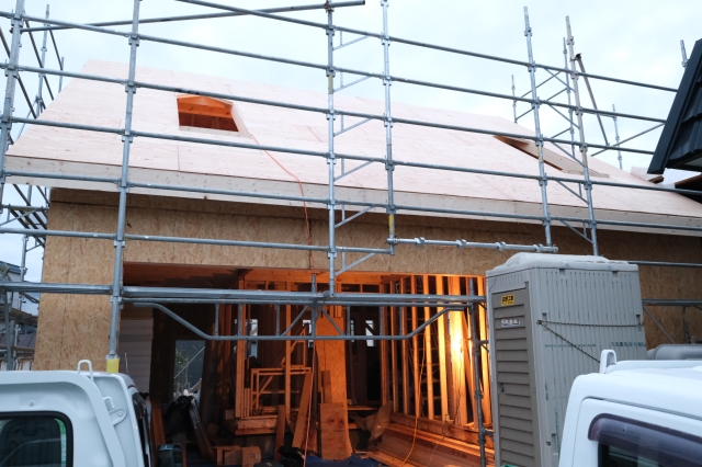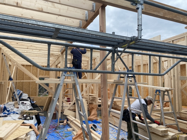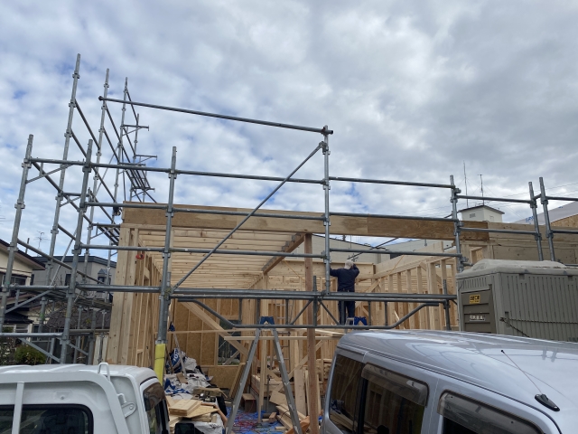 こんにちは。 建築課の濱田滉大です。 先日、建て方がスタートした三内の現場はその後、工事の方が順調に進んでおります。 ここまでご覧の皆さんは「あれっ、いつもの旭工務店の建て方の雰囲気と違うぞ」と思ったと思います(思わなかったとしても、スルーして下さい笑)こちらの建物は、2階建ての建物ではなく、「平屋」の建物になるんですね(^ ^) 建物のタイプが違うと建て方にも違いが出てくるんですね!まあ、私がいつもだと現場に行くのが遅くて、建て方終了間際。ってことが多いのも理由ですが(笑) また、この段階ですでに1階の部屋のスペースは形造られています!ご自身での家造りの際は、図面と見比べながら、「ここが浴室で、ここがリビングかぁ」という感じで見比べてみてくださいね。 この状態の現場が見学できることもレアなので、もしも見学の機会があったら積極的に参加すると、「家ってどうやって造られているのか」が学べるので、ぜひ参加してみてくださいね(^^)/ 旭工務店公式LINE@では直接のお問い合わせメッセージもお待ちしております。 家づくりに関しての気になる疑問から、具体的なお悩みまで、お気軽にご相談下さい