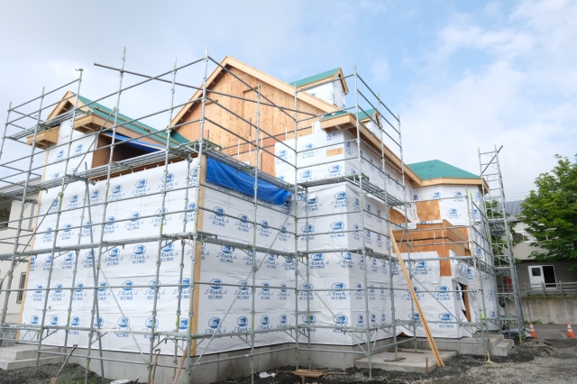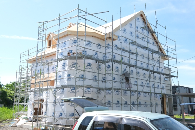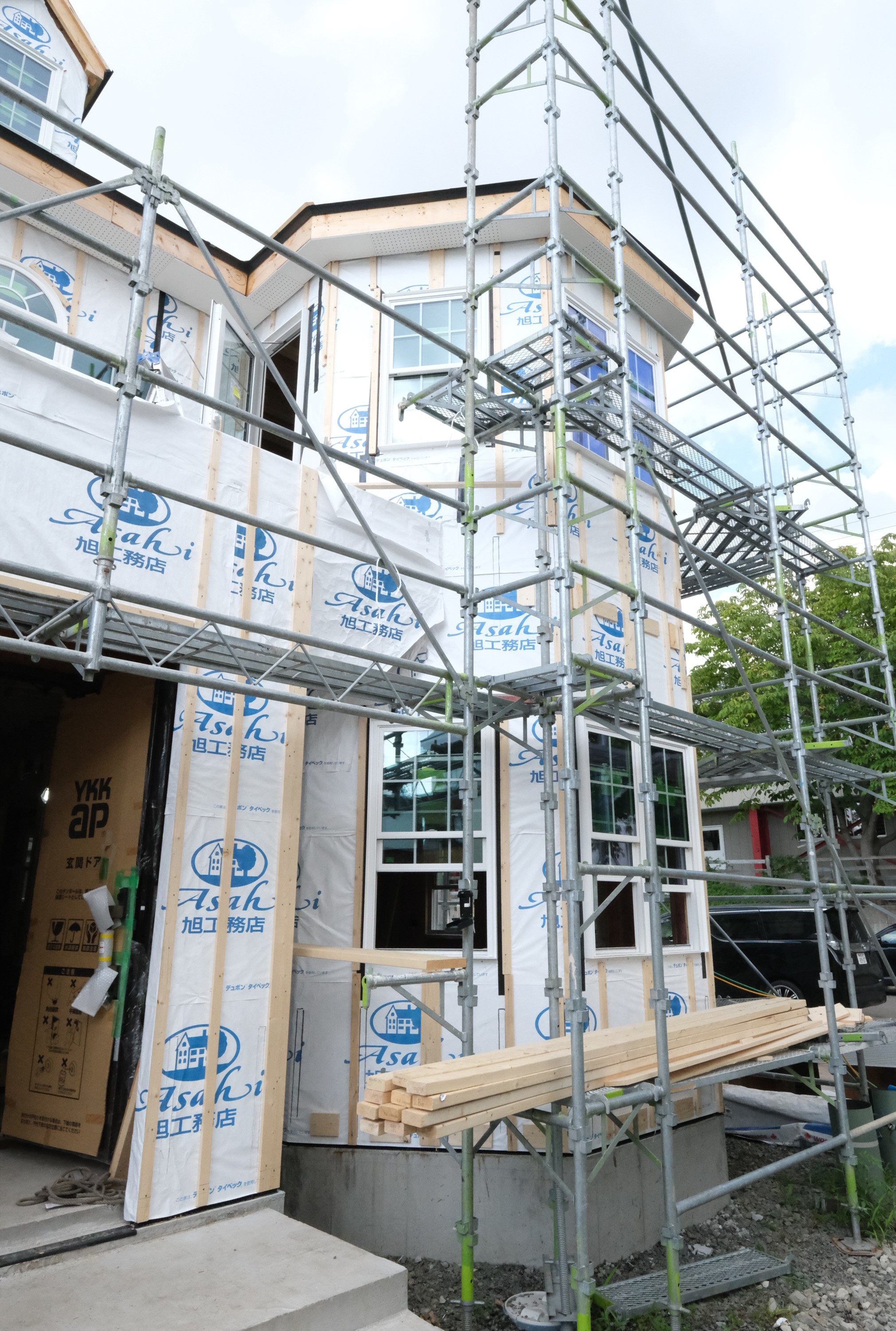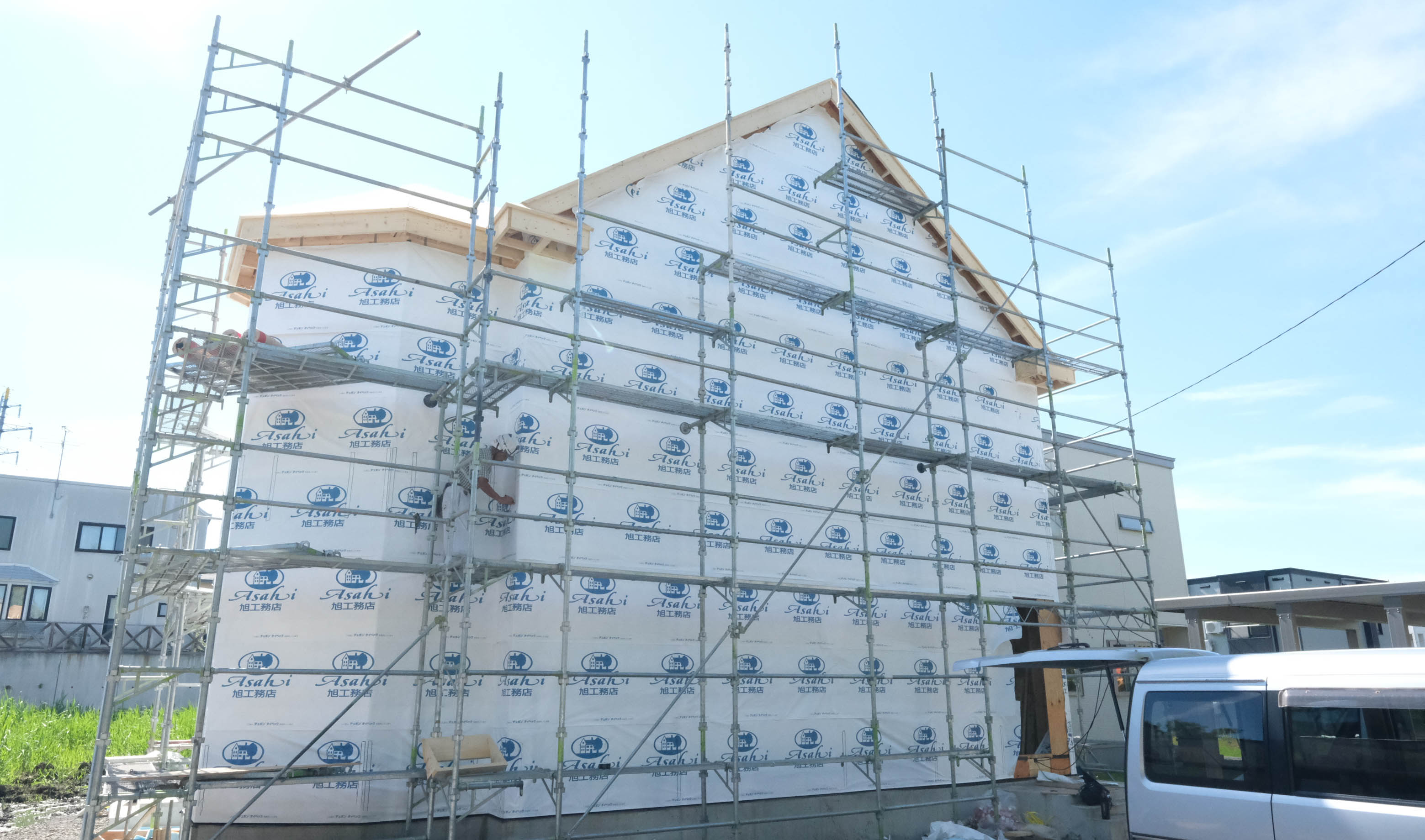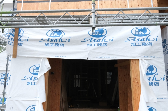 こんにちは。 建築課の濱田滉大です。 幸畑の現場は、「建物工事」が順調に進行しています!! 正面から見ても、改めて「デカいなー」と感心してしまいます。写真だとスケール感が伝わりませんが(笑) 旭工務店のアーリーアメリカンの建物の象徴と言える、六角形の部分(名前募集中笑)も仕上がってきましたね(^^)/ 現在、何を行っているかというと建物の内部工事と同時進行でこれから行われる「サイティング(外壁)工事」の下準備も始まっています!写真の中にも小さく映っている壁に付いている木材を基準に貼っていくからなんですね(^_^)この木材の事を「胴縁」なんて呼んだりもします。 なので、こういう風に木材が貼られている建物は「サイティング工事が行われる直前なんだな~」という風に考える事が出来ます(^_^) ...っと偉そうに書いてきましたが、「アレ?ここの建物はサイティングだったけ?」と不安になって慌ててYouTubeの方に確かめに行きましたが(笑) ここまでは外部工事の話題が中心でしたが、内部工事も順調に進んでおります。