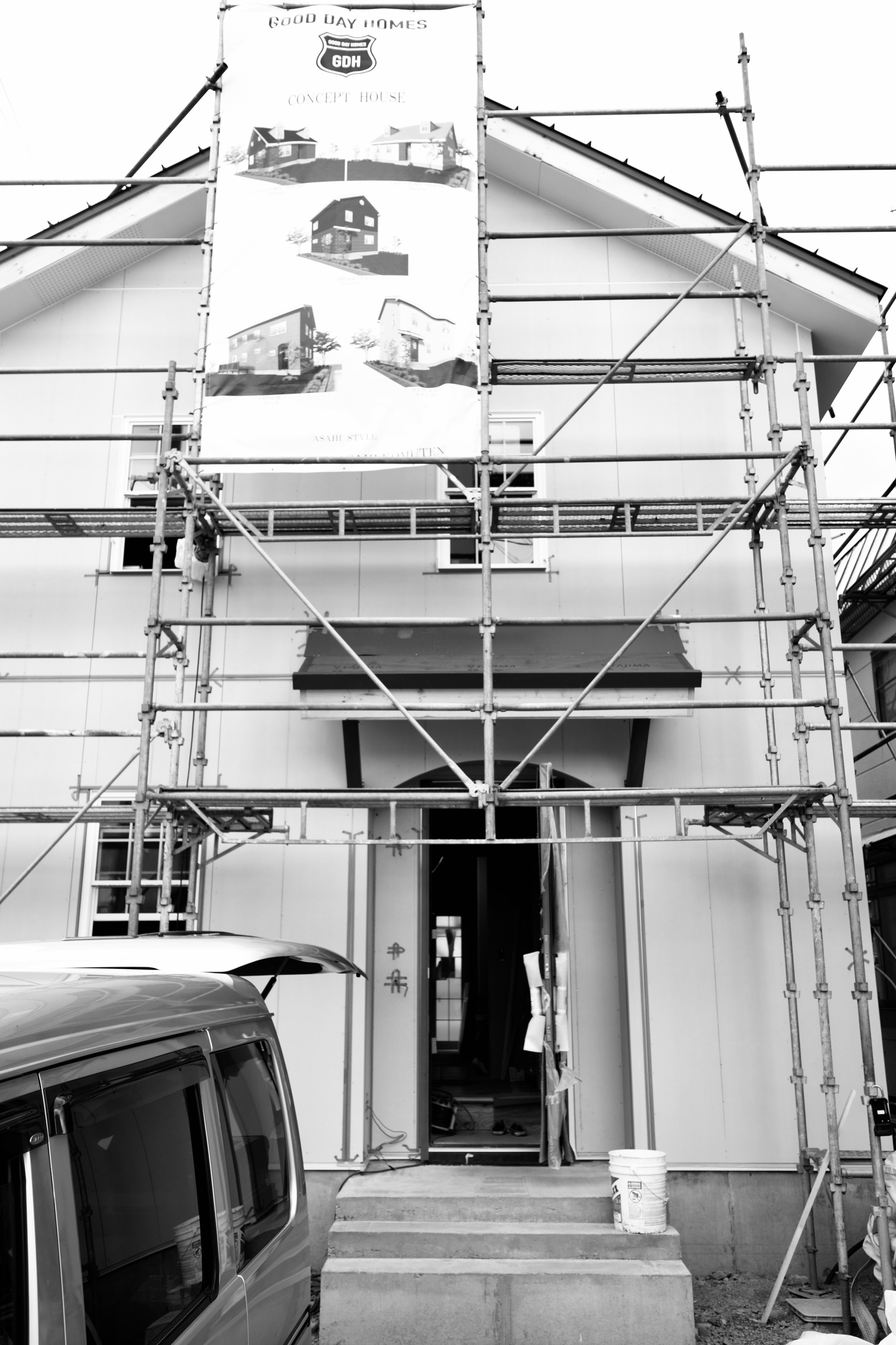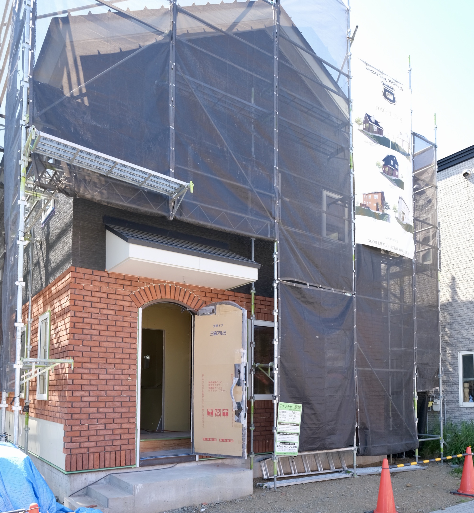 こんにちは。 建築課の濱田滉大です。 若干お久しぶりになりましたが笑旭工務店のNEW MODEL HOUSEの方はいつの間にやら足場がかかりまして、外壁工事が、ほぼ完了しております! いつの間にか終了直前でした笑 「GOODDAYHOMES」のブルックリンタイプの最大の特徴である、レンガタイルもバッチリ決まっていてかっこいいですね(^^)/ブルックリンの外観は何回みても飽きませんね。左官屋さんの腕が光ります。 MODEL HOUSEのある通りの中でもかなり異質な(浮いてる?)建物となっております。