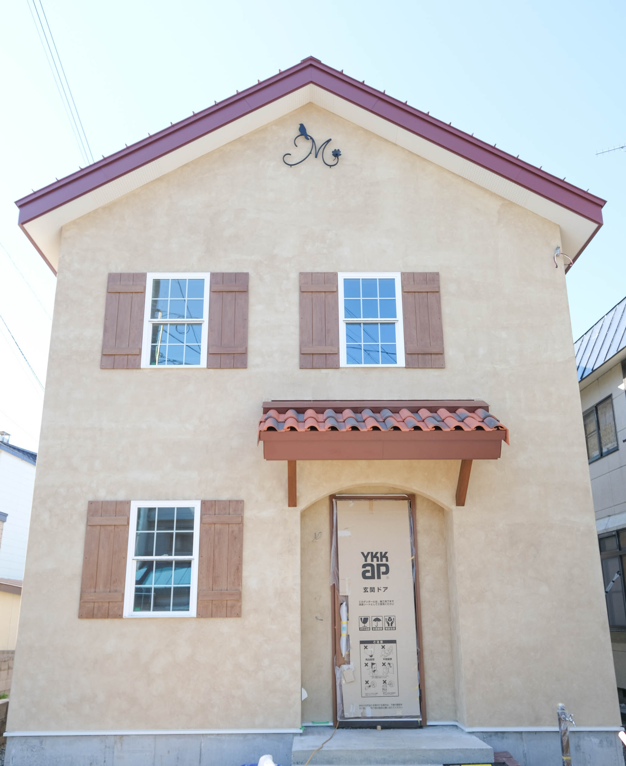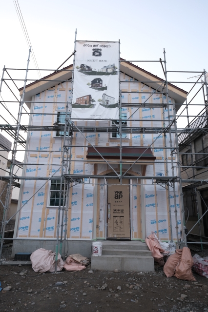 こちらは、GOODDAYHOMESでいうところの「フレンチ」タイプの建物となりますので、外壁が塗り壁となっております。この間まで足場とシートに囲われて見えない状態になっていましたので、外れた瞬間の存在感というのは圧倒的なものがありますね!建物の前を通る方もすごい気になる感じで通られています(笑)