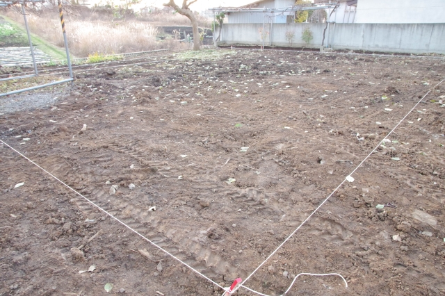 こんな感じの縄が、敷地上に貼られていきます。で、その縄のところに実際の建物が来るイメージですね(^_^)(多少のずれがあることもありますが…)とはいっても、縄を張っただけだと実際の建物をイメージすることは難しいですし、「本当に家の大きさは合っているのか?」と不安になることがあると思いますが…安心してください、大丈夫です!!ちゃんと計算の上算出していますし、実際に現地での計測も行っています!!(原則、私はその計測の手伝いとしてくっついっているだけです笑)