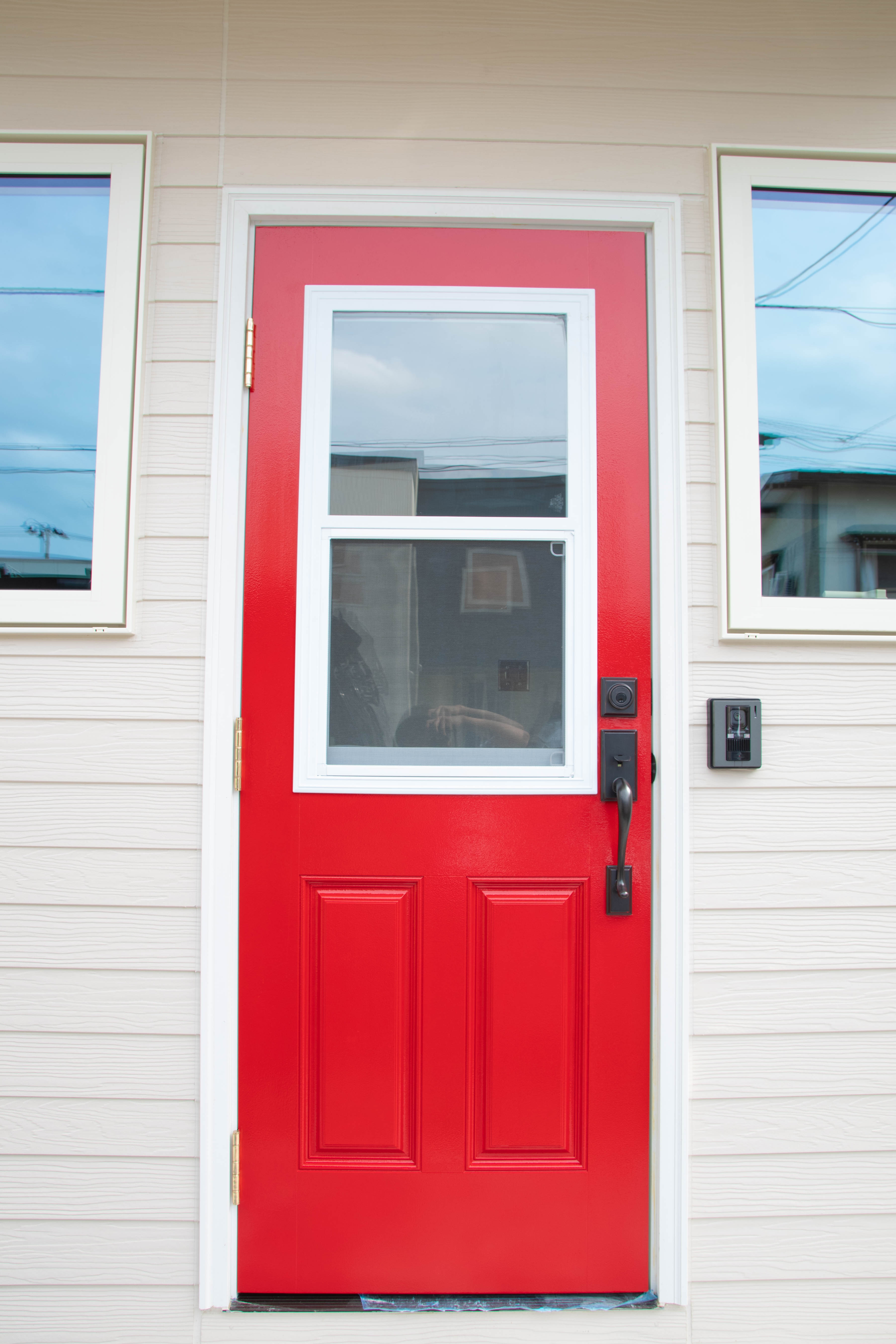 久しぶりにいい写真が撮れて テンションが上がっている濱田滉大です(笑) 本日は、「BROOKLYstyle」オープンハウスの現場の飾りつけ前最後の撮影に行ってきました!気になる玄関からお伝えしていくと.... キターー!!こだわり抜いて選んだ赤い扉にこれまた渋い黒の金具がキマッております♪家具職人の加藤先生と塗装屋さんの素晴らしい仕事が見て取れますね。撮影している最中は私のテンションが上がりすぎて、ガラスに写っている私の影がぶれている事も付け加えておきます(笑)(実は、ドア等の塗装する色はお施主様自ら選ばれていたという事も裏話として....) 個人的に、ベストオブ「おかわ(オシャレで可愛いの略笑)」と思っているのが、このメタリックのアメリカンスイッチです!(^^)!単独でもカッコイイメタリックプレートに黒のスイッチの組み合わせは、独特の存在感があり、素晴らしく「おかわ」かつスタイリッシュですね(^_^) 選んだクロスとフローリングとの相性も良さも見逃せません! 実は各部屋ごとに、扉の色も違い、それらもお施主様のセンスの良さを表現しております。