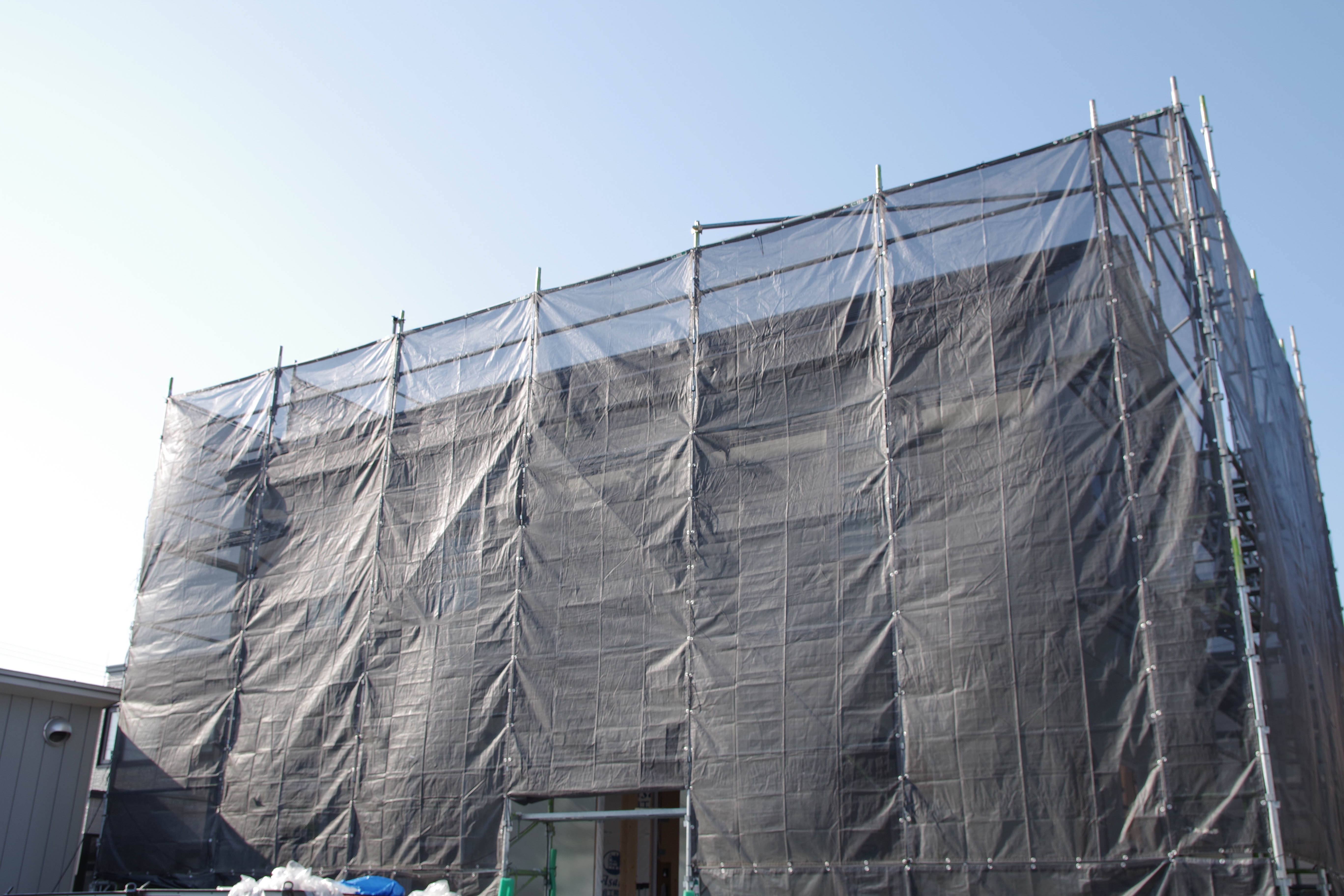シートが掛かっているのでわかりずらいですが、外壁のサイティングが貼り終わっています。チラッと隙間から緑の外壁が見えてますね!シート(カバー)をかける理由に関しては以前のblogにて解説しています(全貌はシートが取れてからです)簡単に説明すると材料が近隣に飛ぶことを防ぐのと安全確保のためです。