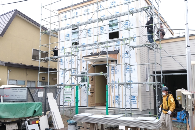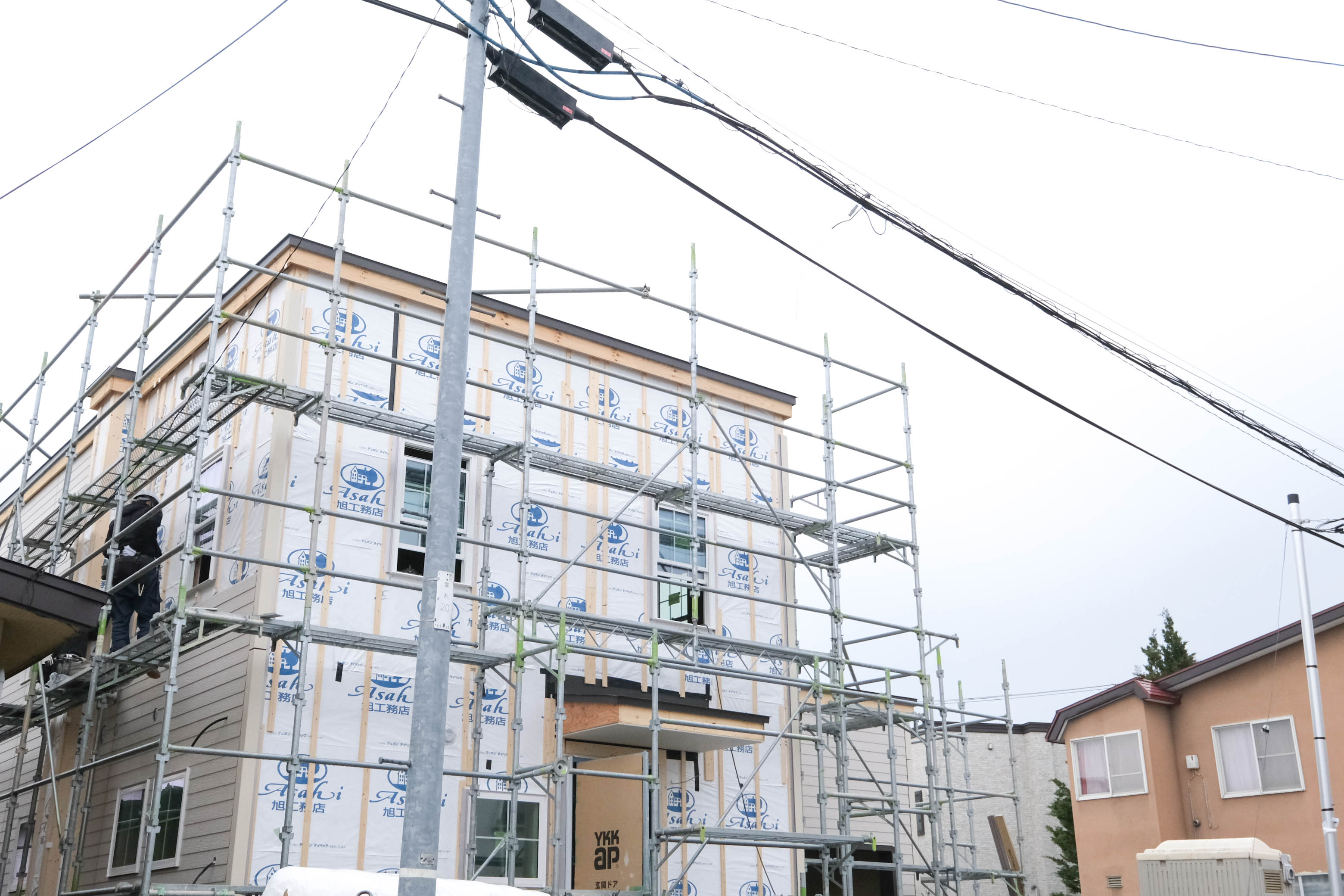 こんにちは。 建築課の濱田滉大です。 私のblogにて紹介している「浪館前田」の現場は建物工事がスタートしています(^^)/ 若干、前回掲載時から間は空きましたが(^-^;現在は、外壁(サイティング)工事の真っ最中です!!足場もかかっているので、外部工事の山場を迎えております!こういう場合、なるべく天候が悪くならない事を祈るのですが、私が行ったタイミングは若干怪しかったです(笑) さて、勘の良い方はこの写真を見ただけでお気づきかもしれませんが、実はこの浪館前田の現場は旭工務店YouTubeチャンネルにて公開中の「NATURAL+ ライフスタイルハウス38坪」の建物そのものなんです!! こう見ると、特徴的なガレージもそのまんまですね(^_^) CG上ではもかなりリアルに表現出来ている....という自負(熱い自画自賛笑)はありますが、実際の建物はどんな感じに仕上がっていくのかも比較しながら楽しんで頂ければ嬉しいです(^_^) O様、いよいよ建物工事ですね!また完成に向けて頑張って行きます! 旭工務店公式LINE@では直接のお問い合わせメッセージもお待ちしております。 家づくりに関しての気になる疑問から、具体的なお悩みまで、お気軽にご相談下さい