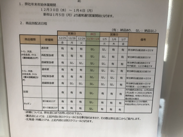 こんにちは。 建築課の濱田滉大です。 旭工務店の冬季休業期間は12月29日(火)から来年の1月6日(木)までとなっておりますが、関連会社はいろんな業種によって違うところがあります。 まず、職人さんは基本的に工務店と大体おんなじ感じでのお休みになります。まあ、当たり前といえば当たり前なんですが(笑)ではもし、お休み中に「○○が壊れた!!」という場合はどうなるかというと、「どうにかなる場合もありますし、どうにもならない場合もあります」ちっとも説明になってない気もしますが(笑)職人さんが対応できても、そもそもの修理用のパーツが届かないこともありますし、っていうかパーツを製造している工場自体がお休みですしね(^^; でそのメーカー等はというと、「メーカーごとによって違います!!」と言ってしまうとそれまでなので(笑)大体12月29,30日から1月4,5日までというのが、一般的っぽいですね。ただ一概にメーカーといってもいろんな部署があるのでそれによっても、バラバラっぽいです(^-^;という訳で、本日年末のご挨拶に来ていただいた「L〇X〇L」(バレバレな気もしますが笑)さんを参考にすると… その他、お休み期間中用に専門の相談窓口を設けているところもありますので、細かいところは各メーカーさんのホームページをご覧くださいませ(^^)/....という丸投げな感じで本日のblogは終了です(^-^; 旭工務店公式LINE@では直接のお問い合わせメッセージもお待ちしております。 家づくりに関しての気になる疑問から、具体的なお悩みまで、お気軽にご相談下さい