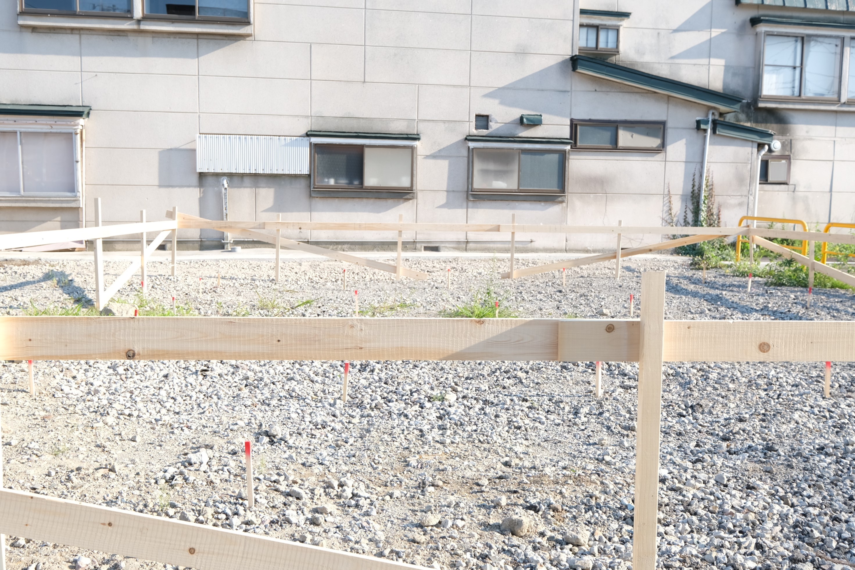 こんにちは。 建築課の濱田滉大です。 先日blogにて掲載したこれから開始となる現場は、「地縄張り」が完了して次の段階となる。「遣り方工事」の段階に入っています!!