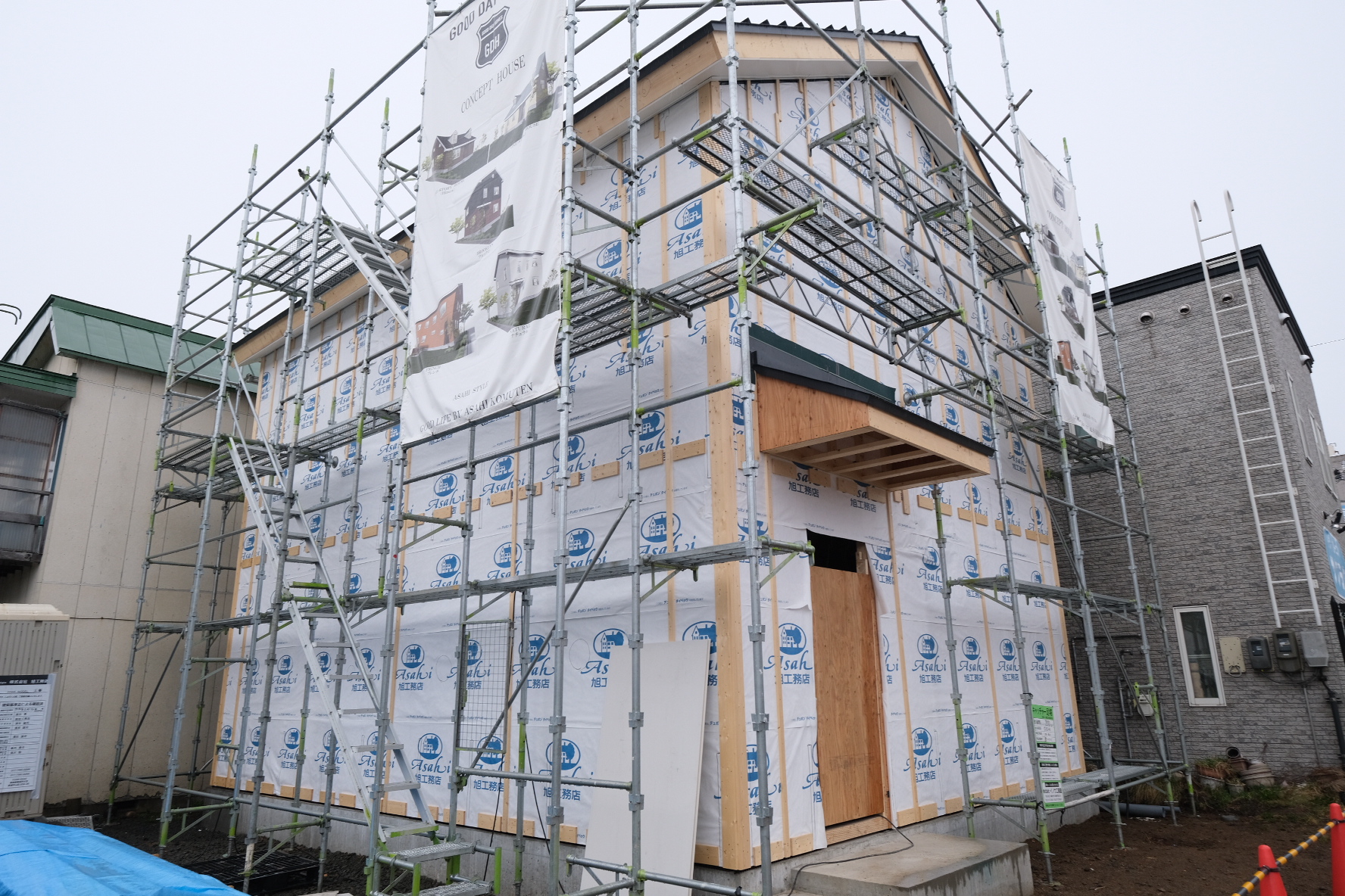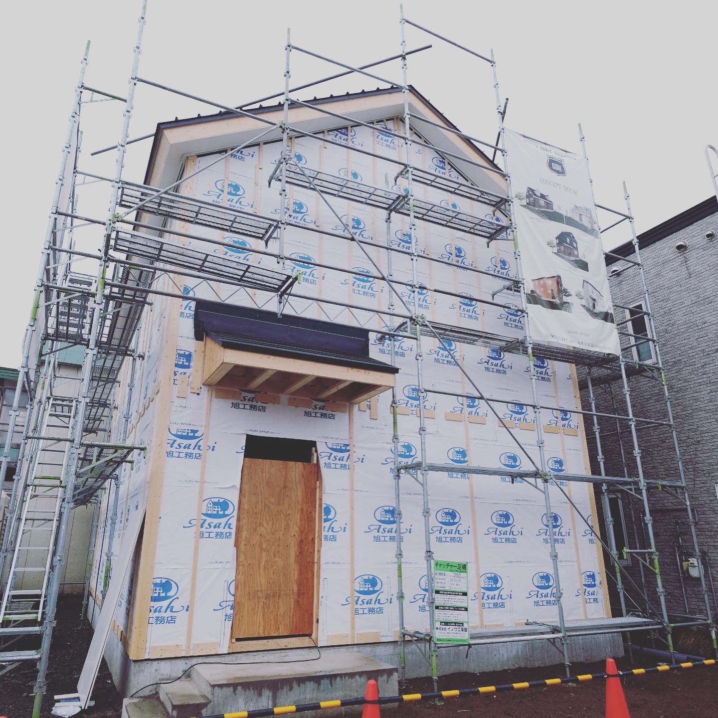 こんにちは。 建築課の濱田滉大です。 昨日のblogでも若干、触れましたが旭工務店のNEW MODEL HOUSEの方は建物工事が、進行しております! 私がサボっているうちに笑ここまで進んでいました(^_^)うちの職人さん達は仕事が早くて、助かります!! ただ、職人さんの仕事が早すぎてある困った事が起きました。ひょっとしたらもうお気づきかもしれませんが家を構成する主要なある建材が、取り付けられておりません。何かわかりましたか?答えは…「窓」です!! そうなんです、職人さんたちの仕事が早すぎて、発注が追い着いておりません(笑)嬉しい誤算です。(問屋さん早く持って来て( ´Д`)) そんな感じでMODELの方は順調すぎるほど、工事が進行しておりますので、興味のある方はぜひ一度新しくなった旗を手掛かりに探してみてくださいね(^^)/
