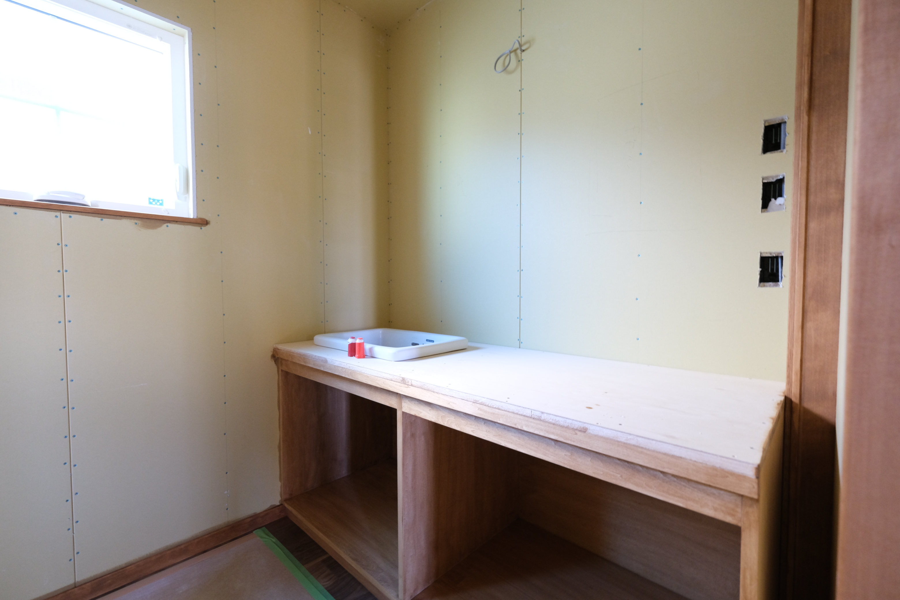 こんにちは。 建築課の濱田滉大です。 私のblogにて紹介している「浪館前田」の現場は建物工事がひと段落しました。 若干、前回掲載時から間は空きましたが(^-^;現在は、外壁(サイティング)工事も終わりまして、足場も取れて、外部工事も終わっております!こう見ると、実際の建物とCGとで超リアルな事が分かりますね(^_^) という熱い自画自賛をかましつつ(笑) 内部の方は塗装工事も行ってまして、旭工務店のオープンハウス等に参加されている方は分かるかと思いますが、奥に見えているのが洗面のボウルになります。という事は、ここは洗面化粧台になる、という事が分かります(^_^)そして、毎度の事ながらここら辺の細かい造作は我らが家具職人の加藤先生が行う事になります。