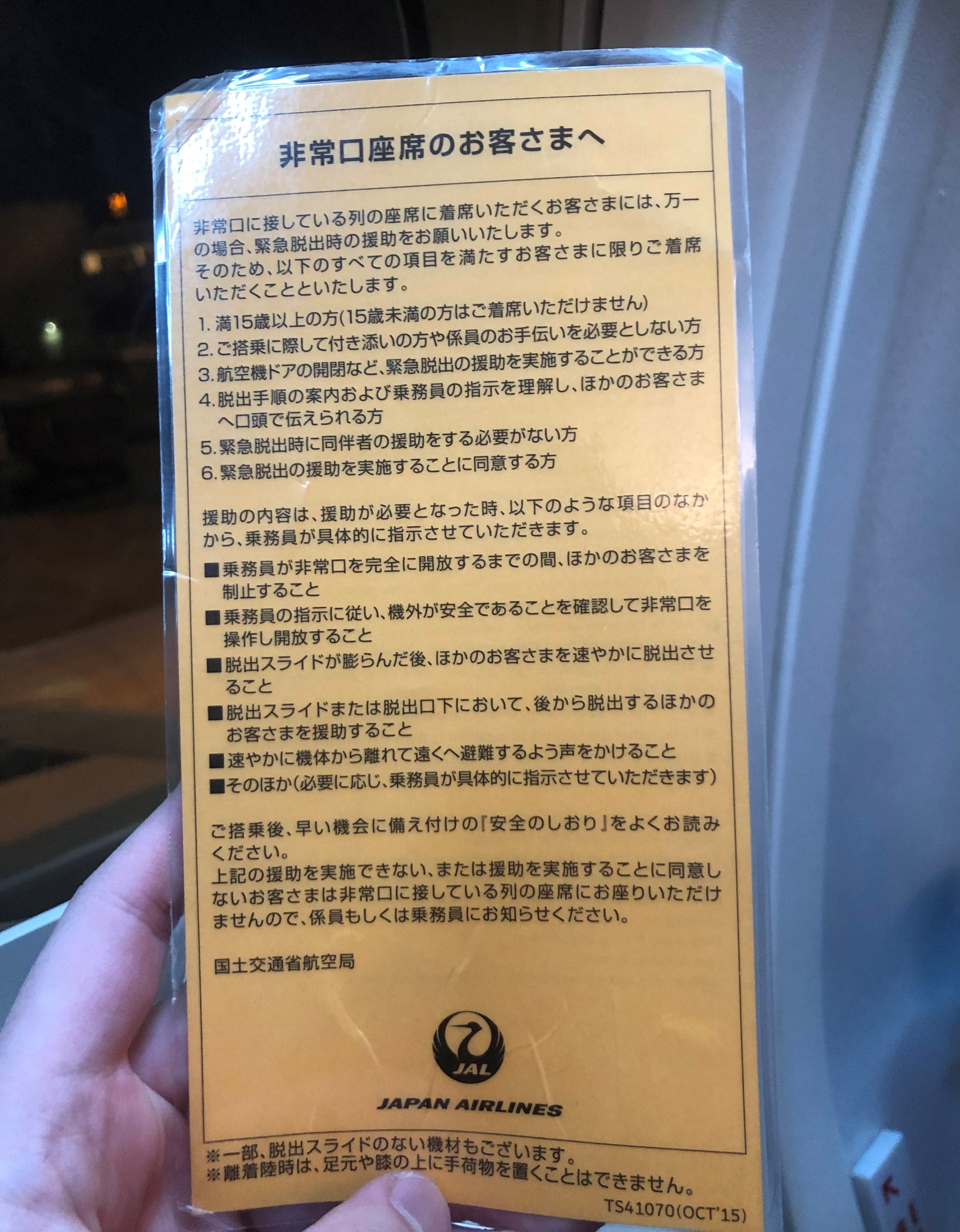 こんにちは。 青森の寒さに安心を覚えている濱田滉大です(笑) 先週、金曜日土曜日と東京の方に出張に行ってきたのですが、その帰りの飛行機の座席のポケットに何か見慣れないものが入っていました。読んでみると.... 何々....非常口座席!!?初の出来事に私がテンパっていると(笑)CAさんがちゃんと説明に来てくれました(^_^)という事で、皆さんが私のようにテンパらないように実際に体験した私が解説していきます!! そもそも非常口座席とは、「飛行機に何らかの緊急事態が起きて、非常口からの脱出をしなくてはならない場合に、CAさんがする脱出の誘導のお手伝い人の事」で、 ・客室乗務員が非常口を完全に開放するまでの間、他のお客さまを制止すること