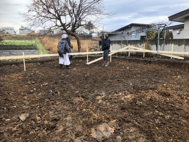 こんにちは。 建築課の濱田滉大です。 今週の冬型の気圧配置のおかげで、すっかり青森が誇るいつもの冬!!という感じですが(あまり、誇りたくはない笑)こうなるとなかなか現場の方では工事が進みずらいというのも以前のblog等でお伝えしてきました。(吹雪の中、足場等に登るのは大変危険です(+o+) 逆に、低いところの工事はあんまり影響を受けません。 という事で、先日紹介した市内の現場の方で遣り方(正確に建物の位置を決めるために行う作業のことで、隣地からの境界線や道路からの境界線から測定し、建物の外壁の位置を決める作業です)を行いました(^_^) 写真自体は先日の物なので、只今、絶賛出張中の社長が写っています(笑) 冬だからといってすべての工事が止まるという訳でもないんですね(^_^)ただ、このペースで雪が降り続くと工事の前に雪かきが必要になりそうです(^^;