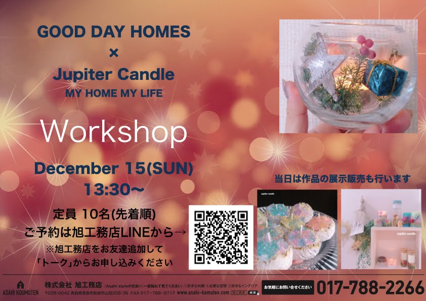 こんにちは。 建築課の濱田滉大です。 DIYイベントの振り返りblogを書く予定でしたが、予定を変更しまして(笑) 12月15日(日) 13:30から「クリスマスキャンドルワークショップ」を開催いたします! 青森市内で人気のJupiter Candle様を講師としてお呼びしまして 自分好みの可愛い、癒される香りのキャンドルづくりが楽しめます! 会場は株式会社旭工務店常設展示場内会場にて(青森県青森市新城字山田 208-36) 参加費1000円になっております(^_^) 予約方法は↓のQRコード コチラの友達追加ボタンから旭工務店のLINE をお友達登録してもらい、トークからイベント参加の方を申し込んでくださいね(^^)/ 定員 10名の早いもの勝ちとなっておりますのでお申し込みはお早めにお願いしますm(_ _)m 当日は、Jupiter Candle様の作品の展示販売も行いますのでそちらもお楽しみに! 細かい詳細はイベントのページにも、掲載してましたのでご確認くださいね→イベント情報 旭工務店公式LINE@では直接のお問い合わせメッセージもお待ちしております。 家づくりに関しての気になる疑問から、具体的なお悩みまで、お気軽にご相談下さい