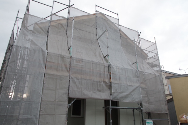 こんにちは。 建築課の濱田滉大です。 色んなイベントが重なって、またもや現場がなおざりですが(笑)イベント好きな工務店という事でお許し下さいm(_ _)m 弘前の現場の方は、外部の大工工事がほぼ終わりまして、ネットが貼られました!!