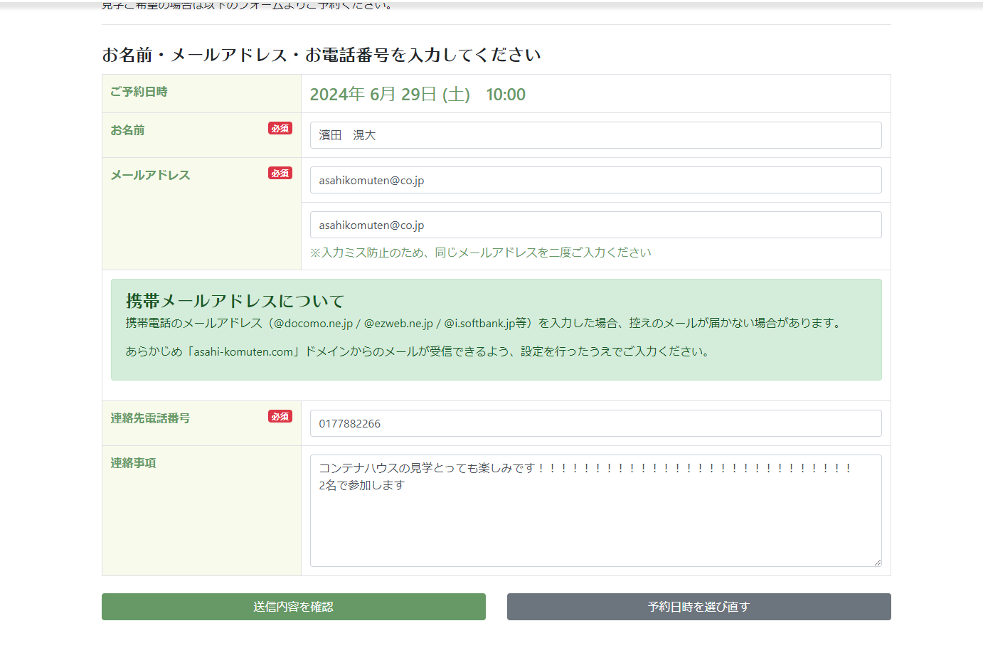 こんにちは。 建築課の濱田滉大です。 新着情報にも掲示してましたが、この度コンテナハウス SELECTBOX 見学ご予約カレンダーを公開しました(^^)/ 見学を希望される日時の「予約」を実際に確認しながら予約することが出来ます!その証拠に明日の午前中は事前の申し込みが入っているので予約する事が出来なくなっています。早くない(笑) ※「予約」の表示がない日時は予約いただけません では実際の予約の流れを皆様と一緒に見ていきましょう!まずは上記のリンクからコンテナハウス SELECTBOX 見学ご予約カレンダーにアクセスします。そうするとご予約カレンダーが出てくるので 希望する日時をクリックしていただいたら 凄い自演だ(笑) 必要項目も記入していただいて、送信内容を確認後、上記内容で予約を押すと見学予約が完了になります!!もし、見学日時の第2希望や疑問点がありましたら、連絡事項に記入してくださいね(^_^) それでは皆様ご予約お待ちしておりますm(__)m コンテナハウス「SELECTBOX」見学会開催! 会場 青森市新城山田208-36(旭工務店敷地内) 開催日時 6月29日(土)、30日(日)10時~17時 お問い合わせ先 TEL017-788-2266または見学予約カレンダーから ・ご氏名 ・参加希望日、時間 ・参加される人数 ・ご住所 ・ご連絡先 をご記入ください。 旭工務店公式LINE@では直接のお問い合わせメッセージもお待ちしております。 家づくりに関しての気になる疑問から、具体的なお悩みまで、お気軽にご相談下さい