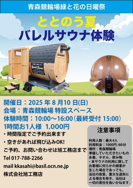 こんにちは。 建築課の濱田滉大です。 事前にお伝えしていた通り、旭工務店のバレルサウナが日曜日の青森競輪場緑と花の日曜祭に出店します!! 当日はキッチンカーや大型のウォータースライダーも色々と用意されているようなので、楽しみですね(^^)/イベントへの出店も回数を重ねて、そんなに直前に焦ることもなくなってきました。勝手がわかってきたのと、現地に実際に行かないと分からないことも多いという部分もあります(笑)まあ、今回は現地も確認してきたので多分大丈夫です。 ※今回のイベントは旭工務店ではなく青森競輪場となっておりますのでお間違えの無いようお願いします 旭工務店公式LINE@では直接のお問い合わせメッセージもお待ちしております。 家づくりに関しての気になる疑問から、具体的なお悩みまで、お気軽にご相談下さい