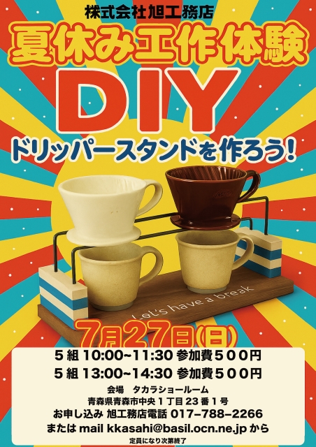こんにちは。 建築課の濱田滉大です。 開催の度に大きな反響があった「旭工務店のDIYイベント」が夏休み工作体験として帰ってきます(^^)/今回はドリップスタンドの作成体験として夏休みの工作にもピッタリです。 7月27日(日) 5組10:00-11:30 5組13:00~14:30 それぞれ5組ずつです。※参加料500円 受付を開始しています!ドリッパースタンドながら本立てやスリッパスタンドにも利用できる優れものです(^_^) 会場はタカラさんのショールームです! 住所は青森県青森市中央1丁目23番1号となっています。 お申し込みは電話 017−788−2266またはmail kkasahi@basil.ocn.ne.jpからお申し込みをお待ちしておりますm(__)m 旭工務店公式LINE@では直接のお問い合わせメッセージもお待ちしております。 家づくりに関しての気になる疑問から、具体的なお悩みまで、お気軽にご相談下さい