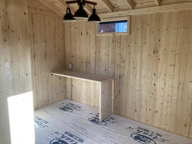 こんにちは。 建築課の濱田滉大です。 11月29日(土)〜30日(日)に開催される移・食・住の防災展でも展示予定の小屋はいよいよ内部の工事も終了しまして、最後の塗装工事が入っております(^^)/ 全体的に可愛い感じで仕上がりました(^_^)木のぬくもりをしっかり感じられる空間です。まだ仕上げの途中ですが、内部には机や照明等も設置されています! この机があるとバイク等の調整にも役立ちそうですね(^_^)個人的にはここでプラモデルを組んでみたいです(笑)ドアの奥には、たっぷり使える自分だけの空間が広がっています。うーん男のロマン^^; これは見学される方を後悔させないクオリティーですので、11月29日(土)〜30日(日)に開催される移・食・住の防災展にぜひお越しくださいませ(^_^)