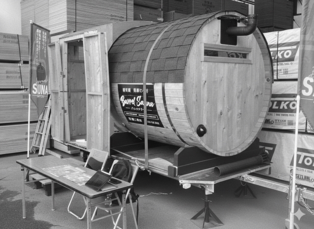 第一号として製作したバレルサウナは、地元の青森ヒバをふんだんに使用したものです。熱源は薪ストーブで、水風呂も備え付け、最大4名まで利用可能です。